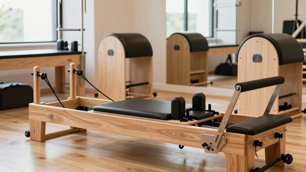 Adjustability features are essential because they allow you to tailor your Pilates reformer to match your specific fitness level and goals. With adjustable rope lengths, pulley risers, and footbar angles, you can modify the intensity and range of each exercise. Multiple height and resistance settings make it easy to customize your workout, whether you’re a beginner or an advanced practitioner. Fully adjustable headrests and shoulder pads enhance comfort and help maintain proper alignment during different movements. Some reformers even include modular components like versatile pulley systems and footbars with multiple positions, increasing exercise variety. The ability to quickly change resistance levels and component positions supports progressive training and guarantees your workout evolves with your skills and goals.