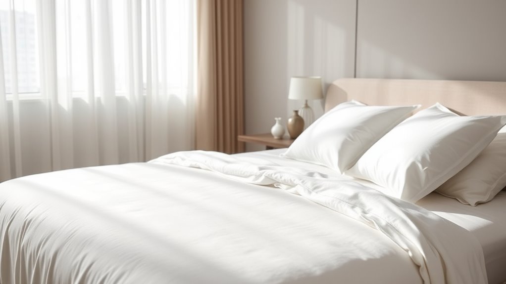 A layer-free bedding setup can markedly enhance your guests’ comfort by providing a cleaner, more inviting sleep environment. Without excess layers, beds feel less cluttered and more breathable, reducing discomfort caused by overheating or restricted movement. This simplicity can improve guest comfort by creating a more relaxed, welcoming atmosphere. Additionally, fewer layers mean fewer allergens and dust accumulations, contributing to better sleep quality for sensitive guests. The streamlined design encourages guests to feel more at home, emphasizing cleanliness and freshness. Incorporating a minimalist approach aligns with modern bedroom design principles, which often prioritize simplicity and functionality. Overall, this approach can boost satisfaction by aligning comfort with modern, minimalist aesthetics. By focusing on essential bedding, you ensure your guests enjoy a restful, high-quality sleep experience that complements the hotel’s contemporary image.