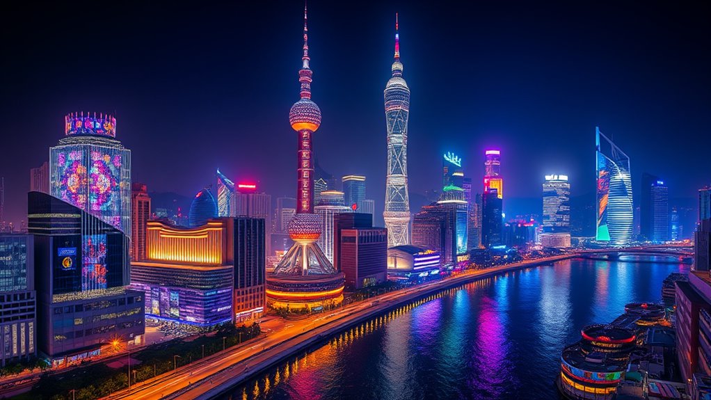 Behind QEELIN’s stunning transformation of Shanghai lies a bold vision to redefine urban beauty through artistry and innovation. You see, QEELIN aims to turn the city into a living masterpiece, blending modern design with cultural expression. They believe that jewelry isn’t just adornment but a form of art that can elevate everyday spaces. By infusing Shanghai’s landscape with creative energy, QEELIN transforms mundane sights into extraordinary visual experiences. This vision pushes boundaries, inspiring people to see their city anew—vibrant, artistic, and full of possibility. The integration of color accuracy in lighting and display designs further enhances the visual impact of their projects, ensuring that every detail contributes to a cohesive aesthetic. It’s a daring effort to craft a cityscape that celebrates beauty, creativity, and the power of imagination.