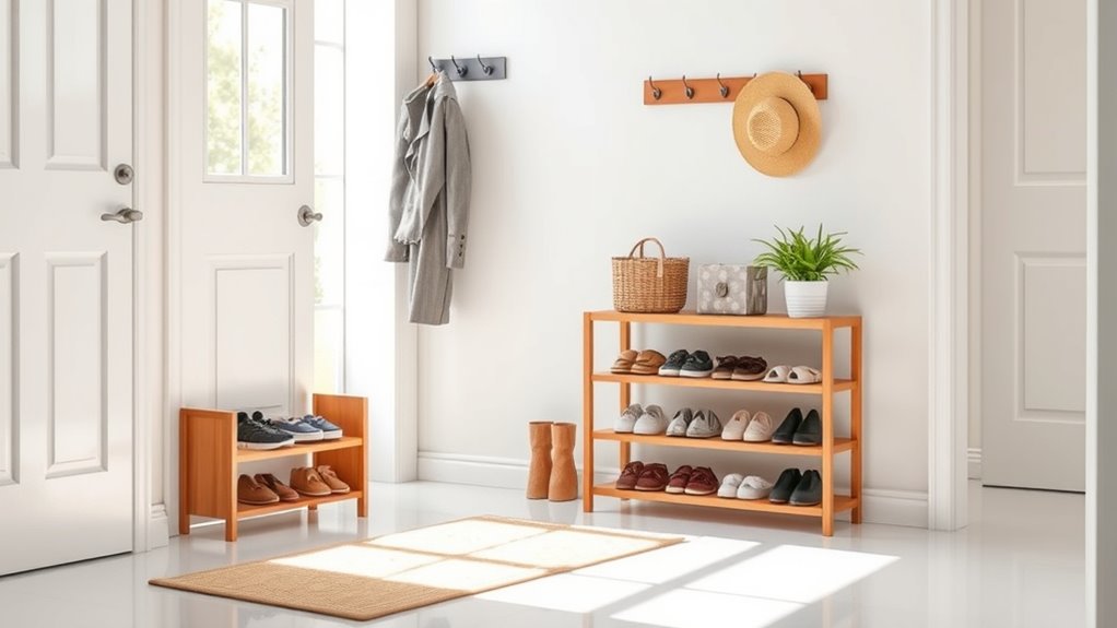 Keeping your shoes neatly organized and out of the way can make a significant difference in reducing clutter and stress at your entryway. Proper shoe storage keeps everything tidy and accessible, preventing piles from forming. Use a dedicated shoe rack or cubbies to separate family members’ footwear, making shoe maintenance easier and prolonging their lifespan. Visualize your entryway with this simple setup: