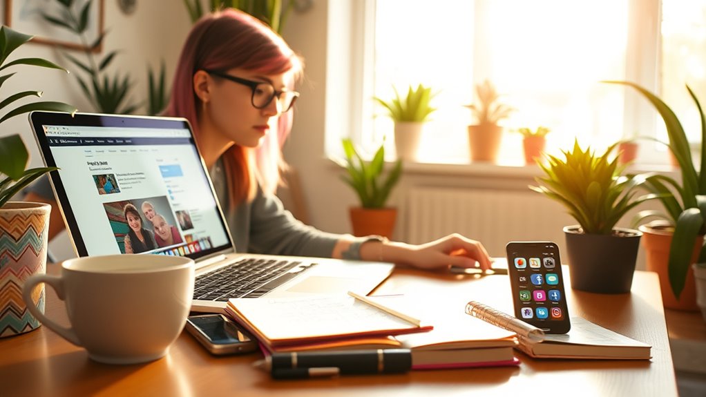 TikTok and Instagram influence your blogging habits by encouraging you to share quick, engaging content inspired by viral challenges and aesthetic themes. You often blend visuals and short captions to attract attention, making your blog more dynamic and visually appealing. These platforms motivate you to stay current with trends, inspiring you to create more authentic, relatable posts that resonate with your audience and keep your blog fresh and popular.