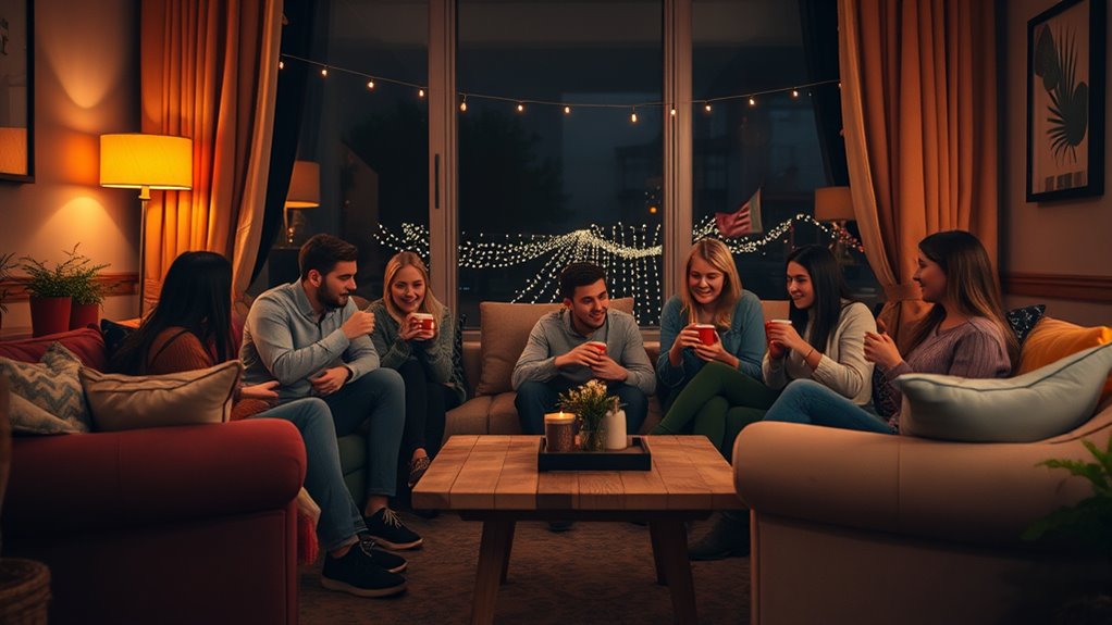 Cozy gatherings boost your mental health by offering a safe, comfortable environment where you can relax and connect deeply. Unlike clubbing, which can sometimes increase social anxiety, intimate settings help reduce it, making social interactions feel less overwhelming. These small get-togethers promote genuine bonds, improve mood, and reduce stress, ultimately supporting your overall mental well-being and fostering a sense of belonging and calm.