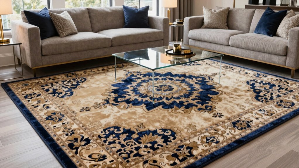 Setting a clear budget is essential when selecting an area rug for your living room, as it helps you narrow down options and avoid overspending. I recommend establishing a budget range upfront to guide your choices and prevent impulsive buys. When considering cost, focus on the price-to-quality ratio—look for durable materials and good craftsmanship within your budget. Keep in mind that larger rugs, like 8×10 or 9×12, tend to be more expensive, so plan accordingly. To save money, explore sales, discounts, or alternative retailers offering high-quality options at lower prices. Don’t forget to allocate extra funds for accessories like rug pads or cleaning supplies, which help maintain the rug’s appearance and longevity over time.