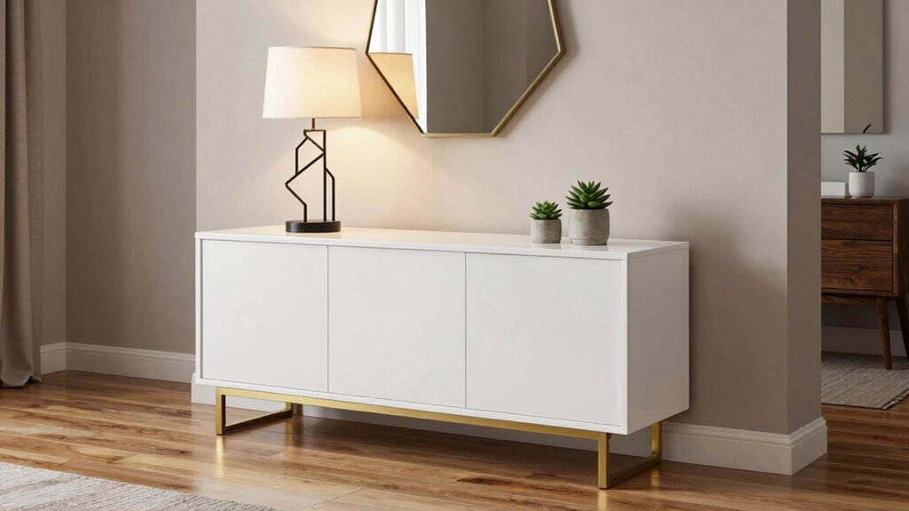 When selecting a console table for your apartment entryway, I recommend considering how much space you have and how well the style matches your decor. It’s also important to think about storage options, material durability, and how easy it is to assemble. These factors help guarantee your choice is both practical and visually appealing.
