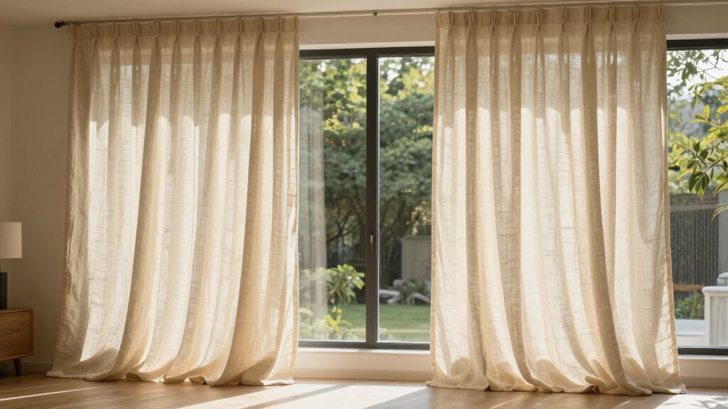 When picking linen curtains, it’s important to take into account how well they fit the specific space and purpose of the room. I always start by measuring your windows carefully to guarantee the curtains provide proper coverage and enhance the room’s aesthetic. Consider the style and opacity you need—blackout options work best for bedrooms, while semi-sheer fabrics suit living areas. Think about the room’s purpose: do you need light filtering, privacy, or insulation? Also, match the curtains to your decor and color scheme for a cohesive look. Ultimately, choose the right length and hanging style to suit your ceiling height and window placement. This way, your linen curtains will blend seamlessly and elevate your space effectively.