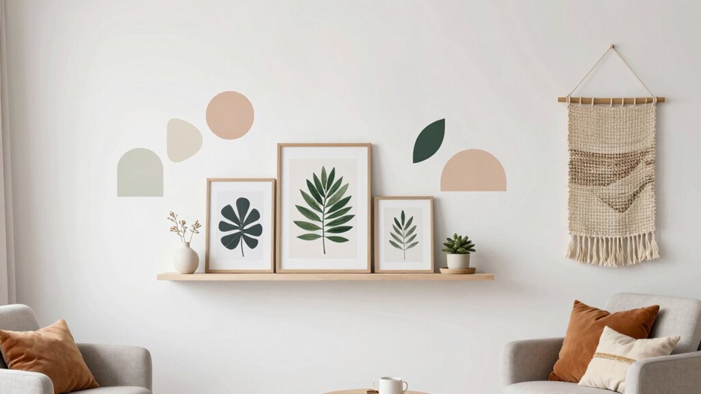Temporary wall decor options are like a breath of fresh inspiration for renters. I love using removable wall decals, which peel off without a trace, and washi tape to frame photos or art. Command strips are my go-to for hanging lightweight items without damage. These options let you personalize your space freely, turning bare walls into a reflection of your style—without any long-term commitment or damage.