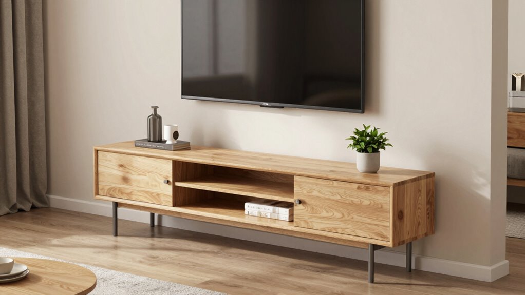 To prevent my small space TV stand from overcrowding, I keep only essential items on it. I choose sleek, compact decor and store extra accessories elsewhere. I also use vertical storage options like wall-mounted shelves for additional gadgets or decor, which frees up surface space. Regularly decluttering helps me maintain a tidy, open look. This way, my small space stays functional without feeling cramped or cluttered.